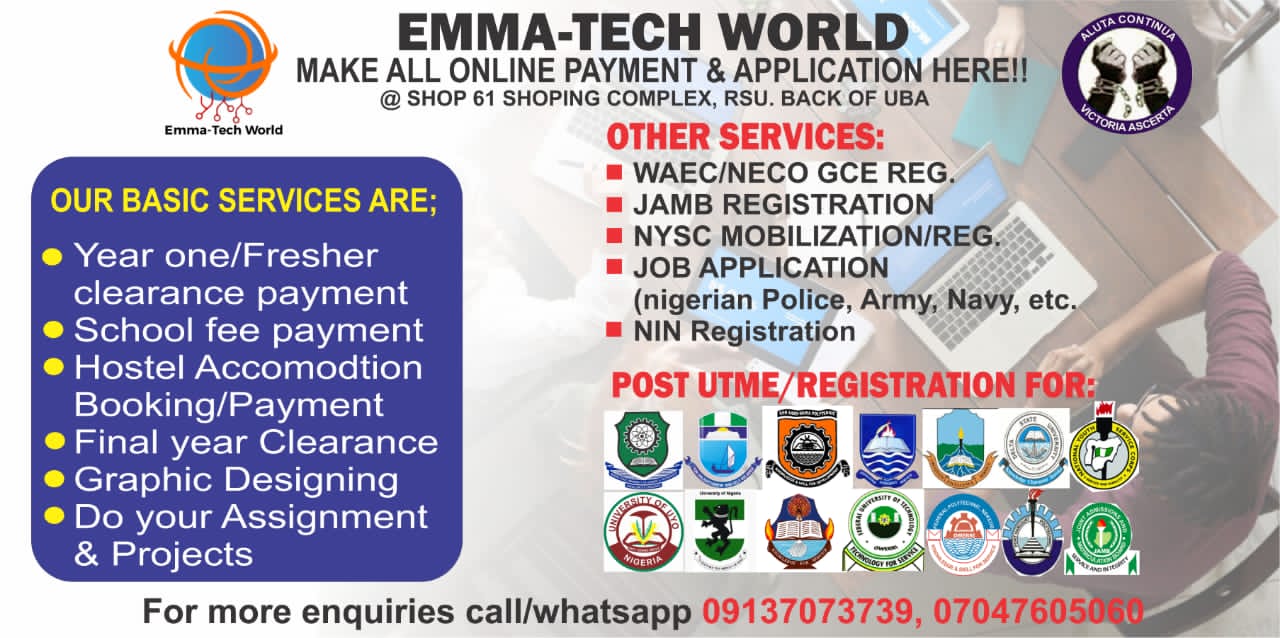 EMT WORLD is a Computer institute dedicated to helping students in the academic society with high-quality digital services such as "University fees Payments, Printing services and Online Registrations for EXAMS, HOSTEL ACCOMODATION, PROJECTS and lots more".